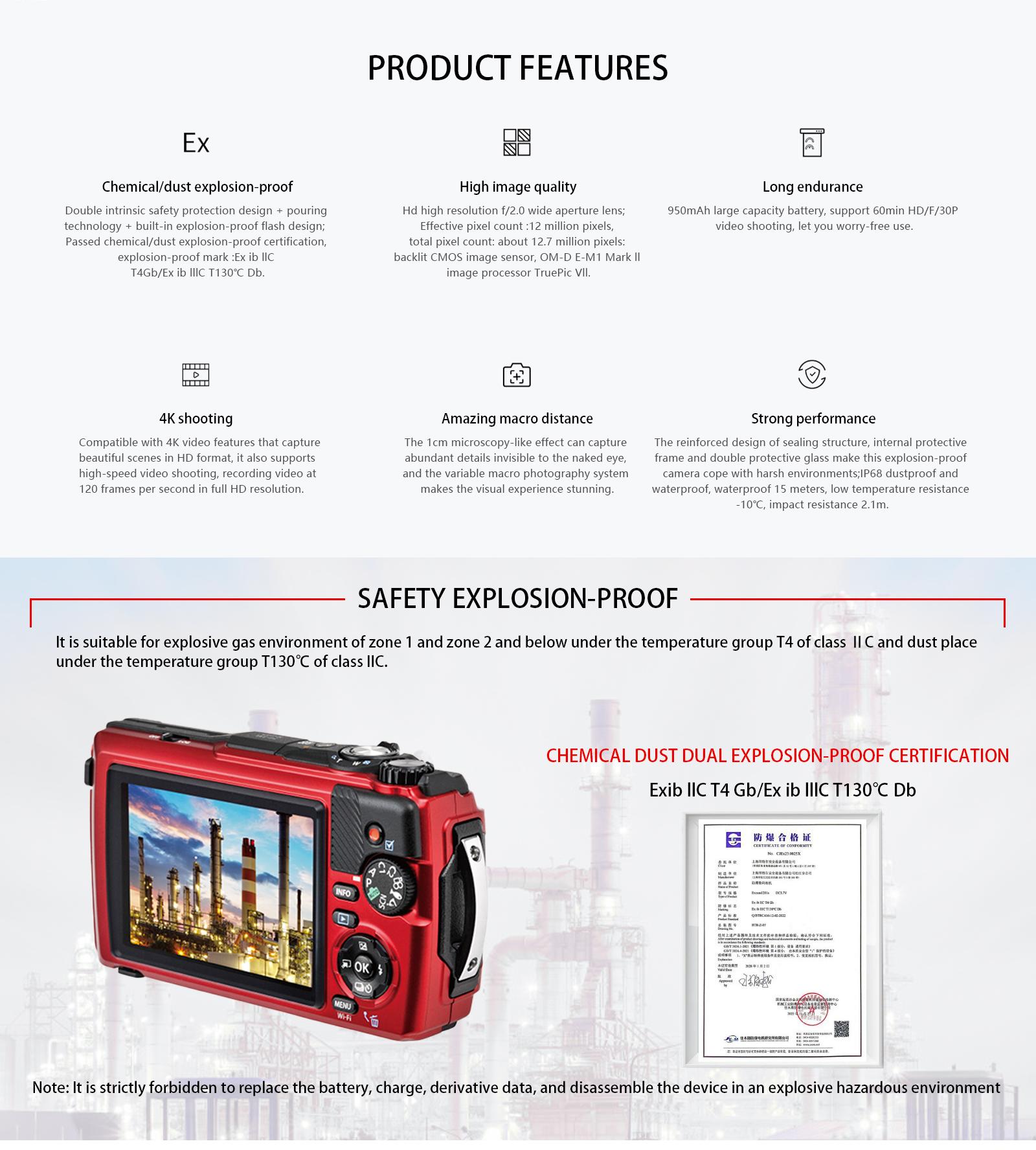 Ex.Mark Ex ib IIC T4 Gb/Ex ib IIIC T130C Db l Screen Display:3’’LCD (1040K,3:2) (non-touch) Effective pixels:12 million pixels, total pixels: about 12.7 million pixels 950mAh safe battery capacity 1cm (0.4") minimum focusing distance l Zoom 4x optical zoom +2x digital zoom l IRIS -f/2.0 (wide Angle) -f/4.9 (telephoto) l ISO aerial speed:100-12800 optional 12MP, 1/2.33" BSI-CMOS sensor l focal length:4.5mm -18.0mm (25mm - 100mm) size and weight: 113 mm×66 mm×32.4mm 253g Waterproof to 15m (45ft), shockproof from 2.1m (7ft), crushproof to 100kgf (220lbf), freezeproof to - 10°C (14°F), dustproof Connect port: HDMI;Wi-Fi Pro Capture mode saves photos before and after the shutter release is pressed, to help you capture the right moment |